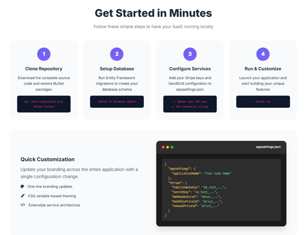 Complete ASP.NET Core platform with Stripe subscriptions, user management, and modern UI. Save 2-3 months of development time with our production-ready foundation.