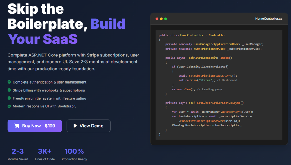 Complete ASP.NET Core platform with Stripe subscriptions, user management, and modern UI. Save 2-3 months of development time with our production-ready foundation.